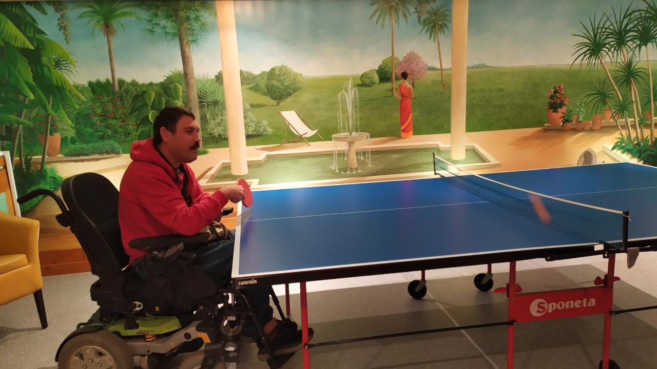 Ci-dessus la salle de télévision, elle sert également aux activités sportives animées par l'éducateur sportif. Il y a du ping-pong, gym, Boccia, Boxe…