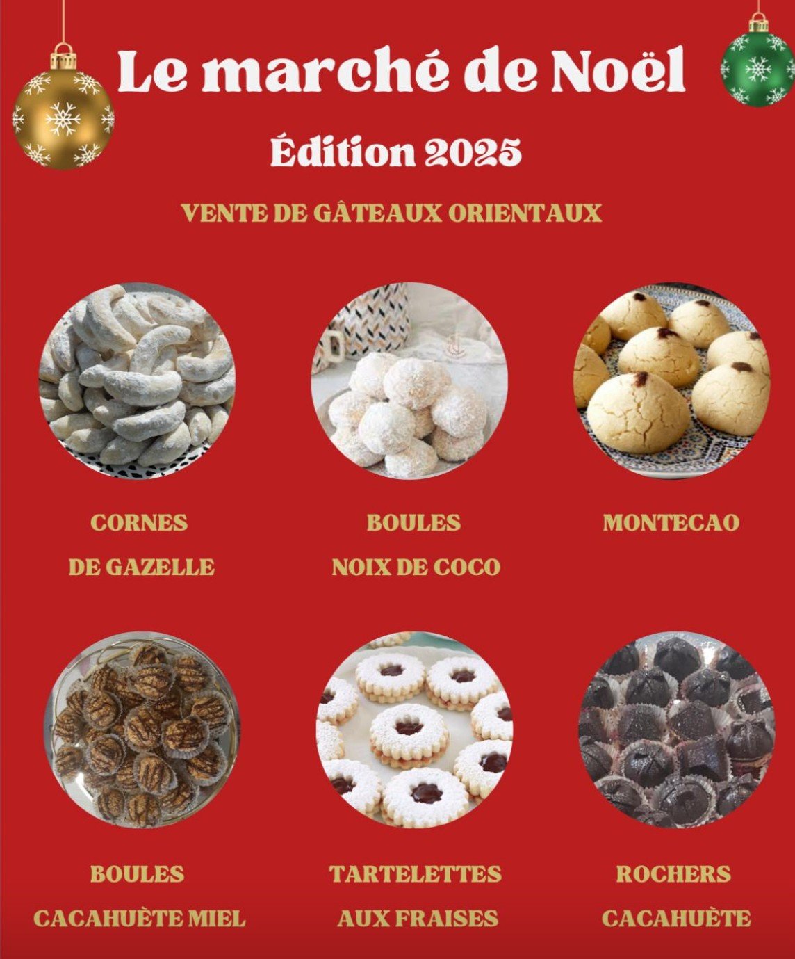 Pour la journée du samedi 13 décembre au foyer les Cascades, divers stands (décorations, bijoux, gâteaux orientaux, crèpes, vin chaud, thé à la menthe, … vous seront proposés.